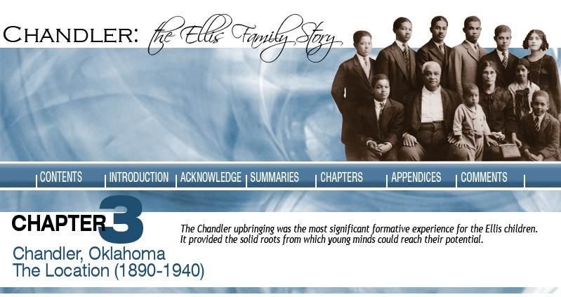 The state of Oklahoma is near center mass of the United States bordered by Texas to the south and west, New Mexico to the west, Colorado to the northwest, Kansas and Missouri to the north, and Arkansas to the east. Prior to statehood in 1907, one half of the state belonging to several Indian tribes was called Indian Territory. The other part, mostly the western half, was called Oklahoma Territory and belonged to the United States. Because of its rough and rugged nature, early history books sometimes referred to the area as the “uninhabitable” part of the United States. On September 28, 1891, immediately after a land rush, Chandler was founded. In the land rush some 975,650 acres of land, formerly owned by the Sac and Fox, Iowa, Pottawatomie, and Shawnee Indian tribes, was divided among thousands of people participating in one of many land distributions in the Oklahoma Indian Territory. Originally, Chandler only comprised an area of about one square mile. The first plat divided the town east and west by numbered streets 1-15, and north and south by eleven named streets such as Manvel, Allison, and Steele Avenues (city map of Chandler can be found in Appendix A). Since Chandler's original founding, city boundaries have been extended several times. Despite the expansion, the majority of the residents still live within the original 1891 city boundaries. While there have been some variations, the population of Chandler has never gone above 3,000. The 1900 census recorded about 2,000 residents, and the one in 2000, almost 3,000 citizens. Chandler is a typical Oklahoma county seat. Manvel Avenue, a main street several blocks long, is the centerpiece of town (and is often referred to as “ Main Street” in our story. Most businesses, office buildings, and the county courthouse are located along Manvel Avenue. Residential housing extends outward for several blocks in all directions. Most residential homes were built on spacious lots, and during the first half of the 20th century colorful vegetable gardens filled their yards. Sometimes part of a yard would house a cow, chickens, or other livestock. Off to one side of the business area, one normally found a large agricultural facility such as a grain mill and elevator. As in many Oklahoma towns, business and agriculture co-existed in close quarters. In Chandler, the county courthouse was located near the center of town. My uncles recall one of its most amusing features. Before indoor plumbing and water fountains were established, a large, open barrel of public drinking water was maintained just inside the front entrance to the courthouse. A cup hung from each side of the barrel; one of the cups was clearly labeled, “For Colored Only.” After seeing people chewing tobacco and others with dirt-covered beards quenching their thirst, none of the Ellis family would drink from the barrel. Oklahoma towns are generally located on flat land, with unobstructed views in all directions. In this respect Chandler is quite different. The town is neatly perched on top of a large hill within which are a series of smaller hills. The town’s homes, stores, and buildings are scattered among the smaller hills. In some places, driving on city streets is like riding a roller coaster. “Bell Cow Creek” is a well-known local landmark, running west of Chandler, barely touching the western-most edge at Tilghman Park, and probably deriving its name from a cow. On farms a bell was hung around the neck of the cow that always started home first. This cow led the remainder of the herd back to the safety of the barn at the end of the day. The Ellis children and their friends, both black and white, spent many hot, happy summer hours swimming in the small reservoir created by the creek. In the Chandler area earth is reddish in color not a true red, but a color similar to that found in bricks used to build houses. This special “flavor” of red colors the landscape with a dull building brick appearance. The red earth turns to a fine, irritating dust in the dry season. It is impossible to escape the red dust whipped about by small gusts of unexpected wind. Houses located near unpaved roads must be dusted two or three times a day. In the rainy season, the earth turns to red clay. In the old days, the heaviest rains came in May. From February to mid-June, at times it was barely possible to navigate the dirt roads of the county. Those who arrived in the city by horse and buggy were covered with red clay, their animals painted red from head to hoof. At the end of their journeys, those who walked the roads faced the time consuming task of cleaning thick red mud from their shoes and clothing. In the 1920s, and possibly earlier, to facilitate walking in the downtown area, wooden walkways were built in front of the stores and offices on Manvel Avenue. The wooden sidewalks resounded with “thuds” whenever someone walked on them. Imbedded in today’s cement sidewalks are some of the original horse rings used by cowboys, travelers, and everyday visitors to tie up their horses. Chandler’s special type of red earth was perfect for making bricks. Bricks made in Chandler were shipped all over the state. Before statehood, the bricks were stamped “OT,” for Oklahoma Territory. The few subsequently produced were stamped “Chandler, Okla.” Today, these bricks are sold as souvenirs and antiques. The wind and shifting red dust often hide vestiges of the past. Urban Green and his family were white residents who lived on a farm about 1½ miles north of Dudley, Oklahoma about 18 miles northeast of Chandler. Urban recalls a happy childhood playing with the children of his black neighbors. He specifically recalls an old swimming hole just behind the family farmhouse. In the 1920-30s, many playful hours were spent jumping from a natural solid-rock platform into the water some seven or eight feet below. In the 1990s Urban returned to the old home site. The swimming hole and the rock pl