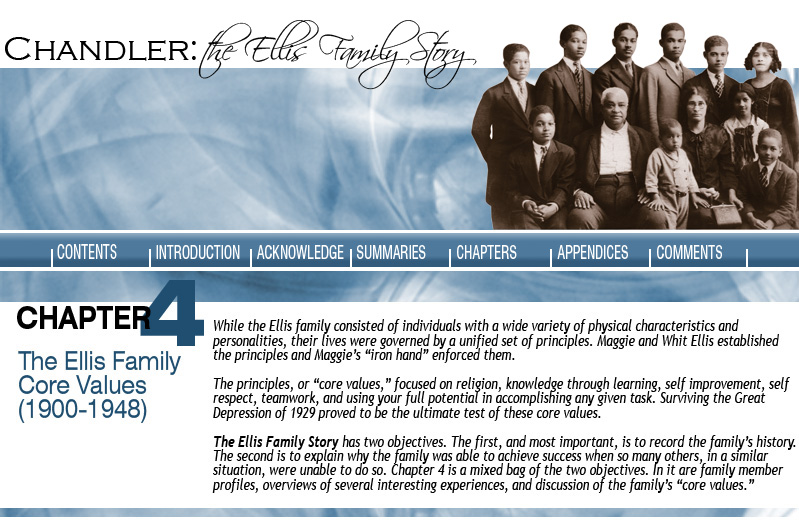 Although the Ellis children did not conform to any one physical or personality type, they developed uniform approaches to the everyday challenges of life. This is traced back to the clear and consistent guidance received from Whit Ellis, Maggie Ellis, Ann Riley, James Riley, Mrs. L. Lena Sawner, and a few other key persons. By far, Maggie Ellis was the most dominant influence in developing these uniform approaches.