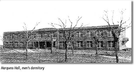 Marquess Hall men’s dormitory was built in 1922 at a cost of $40,000. It was one of the many buildings constructed using student labor. The objective of the labor program was to not only provide housing for male students but also train them in construction industry skills. Construction using student labor was a very slow and arduous process. Each one of the student-constructed areas had to be carefully inspected by a teacher. During the construction of Marquess Hall there was concern about the overall strength of the building. It needed to be strong enough to resist the often violent Oklahoma weather. In their enthusiasm to meet the challenge of the weather, students constructed walls with several layers of brick. These walls were carefully built under the blazing Oklahoma sun. The finished product was a concrete, bunker-like facility that could have been used in a combat area. The efficiency of the students’ labors was not appreciated until 1972, when Marquess Hall was to be torn down and replaced by a newer and larger facility.